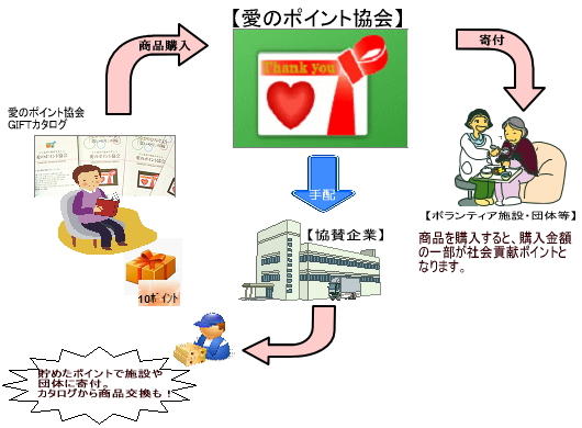 商品を購入して社会貢献しませんか。 協賛企業の協力により、購入金額の一定額をボランティア施設・団体に寄付します。 また、商品購入時に発行されるポイントを各団体に寄付、または素敵な商品と交換も出来ます。